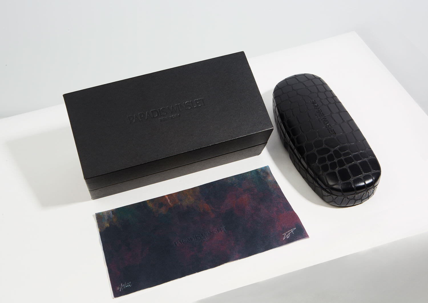 HARD SHELLED BLACK AND METALLIC SILVER LOGO BOX AND ALL BLACK BOX WITH A CUSTOM CROC CASE IN ALL BLACK, AUTHENTICITY CARD, HANDWRITTEN FEATURING PW SIGNED AND DATED ARTWORK THANKYOU CARD. FEATURING A POEM NEVER PUBLISHED BEFORE AND A MICROFIBER CLEANING CLOTH. -